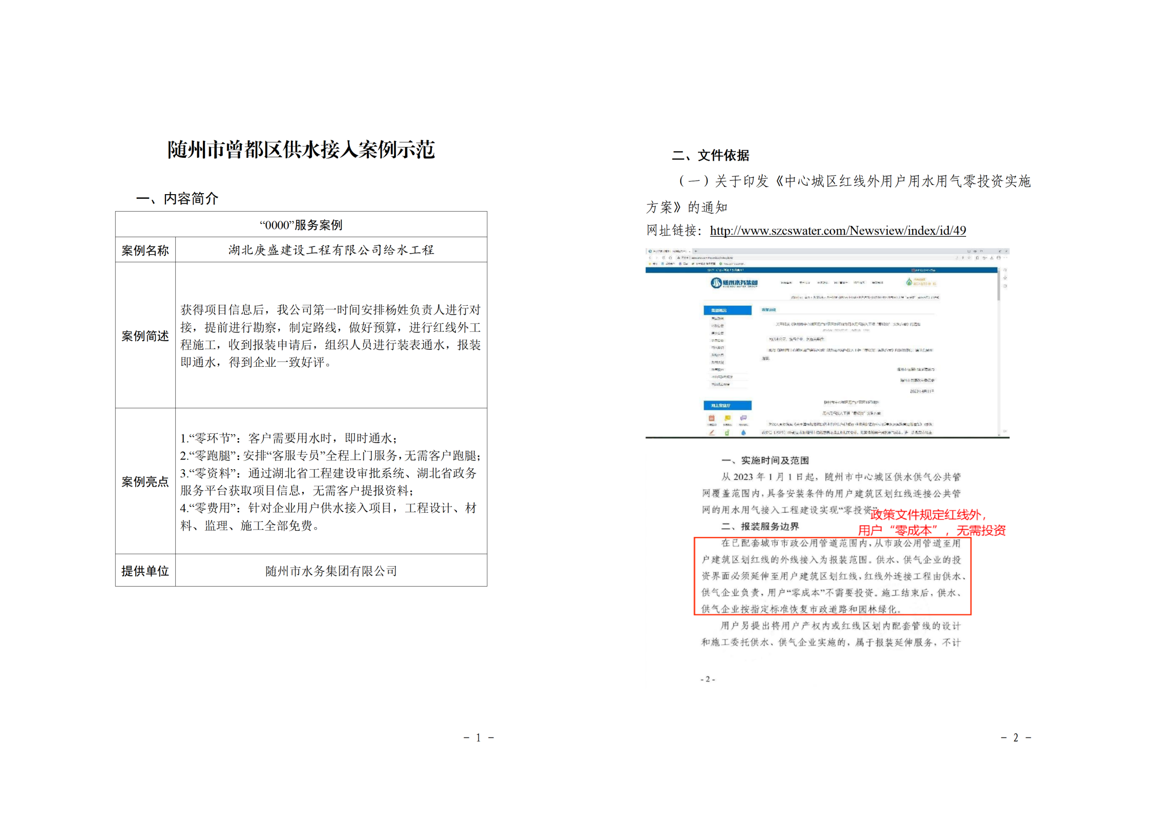 隨州市水務(wù)集團主要職責是向隨州市中心城區(qū)、曾都區(qū)、隨縣以及高新區(qū)提供供水服務(wù),集團公司下轄城市供水公司、建設(shè)工程公司、水質(zhì)檢測公司、隨縣供水公司、康潤實業(yè)公司5家全資子公司。下面展示隨州市曾都區(qū)供水接入案例示范。