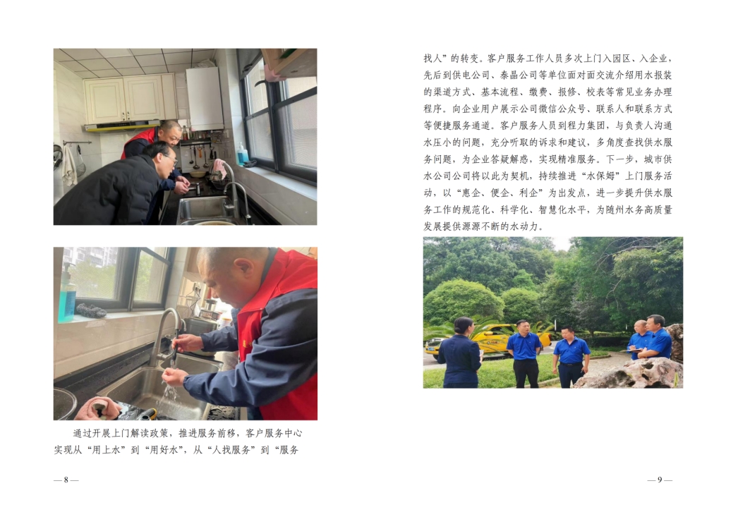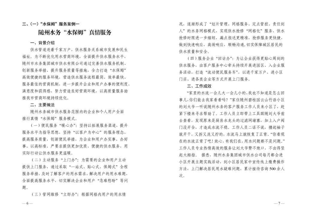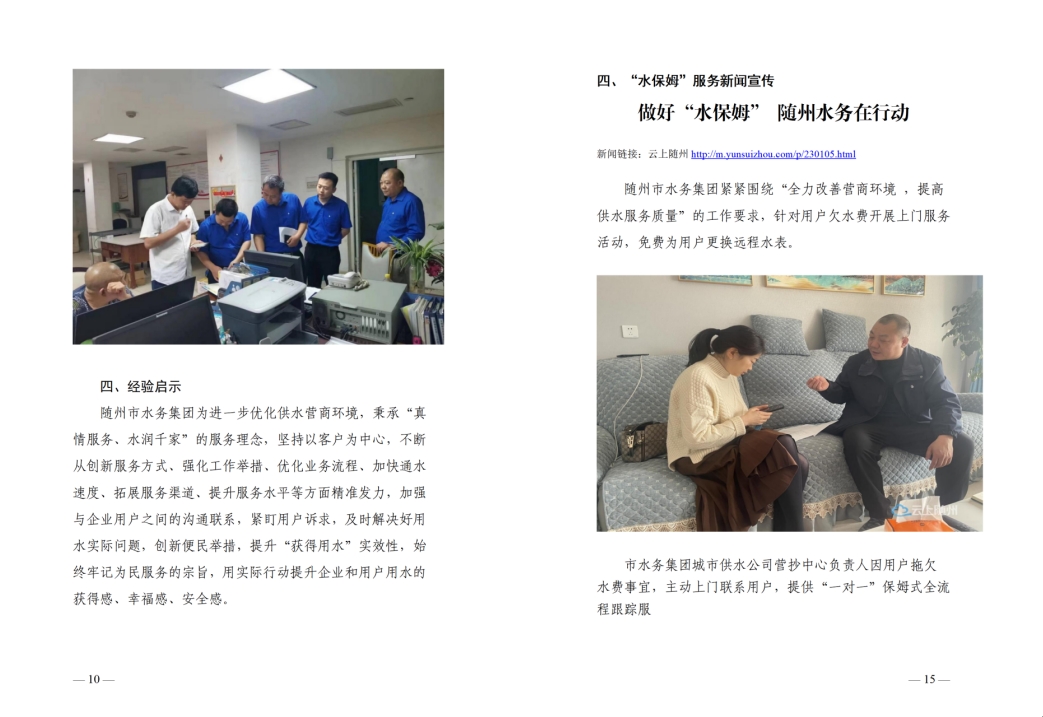 為全面提升供水服務(wù)水平,優(yōu)化供水營(yíng)商環(huán)境,隨州水務(wù)集團(tuán)推出“水保姆”供水服務(wù)新模式,建立“供水服務(wù)網(wǎng)格員”隊(duì)伍,通過(guò)開(kāi)展清表核查、網(wǎng)格劃分、聯(lián)合社區(qū)共同解決用戶問(wèn)題等亮點(diǎn)行動(dòng),讓百姓暖心,讓企業(yè)放心。