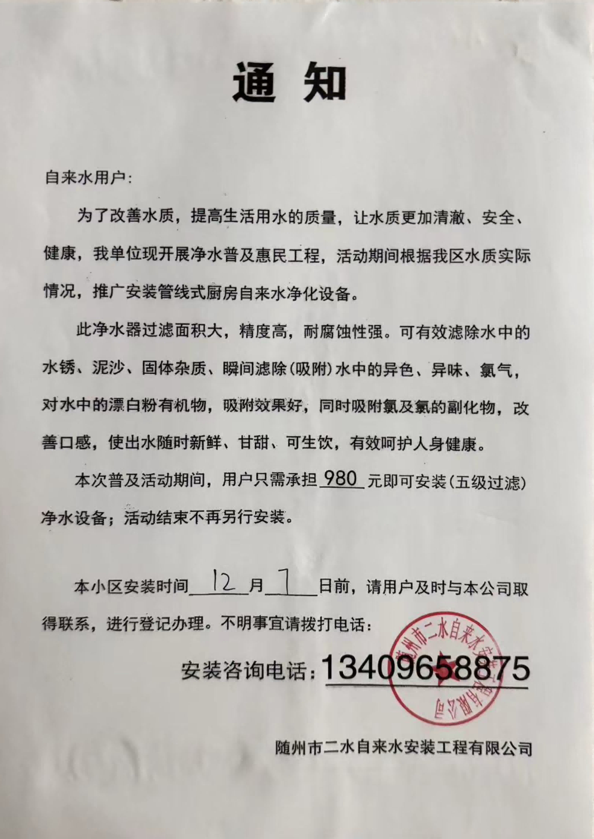 近期,我公司在隨州城區(qū)多個(gè)小區(qū)發(fā)現(xiàn)以“隨州市自來(lái)水凈水設(shè)備安裝工程公司”“隨州市二水自來(lái)水安裝工程有限公司”等公司名義張貼的《通知》。該行為打著改善自來(lái)水水質(zhì)的幌子,誤導(dǎo)自來(lái)水用戶,推銷凈水設(shè)備,已造成惡劣影響?,F(xiàn)為維護(hù)我公司和廣大市民的合法權(quán)益,特鄭重聲明如下: