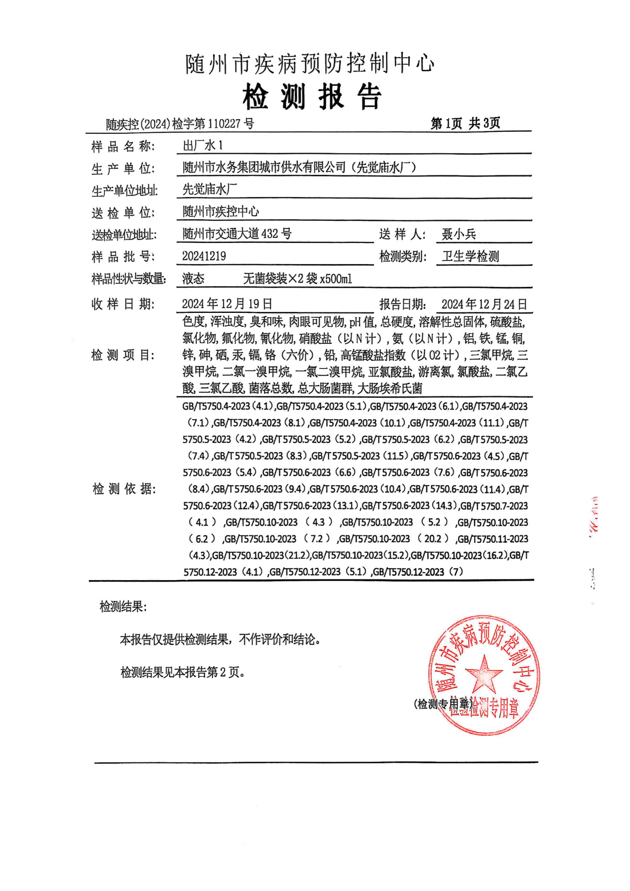 城市供水出廠水水質(zhì)檢測(cè)報(bào)告
