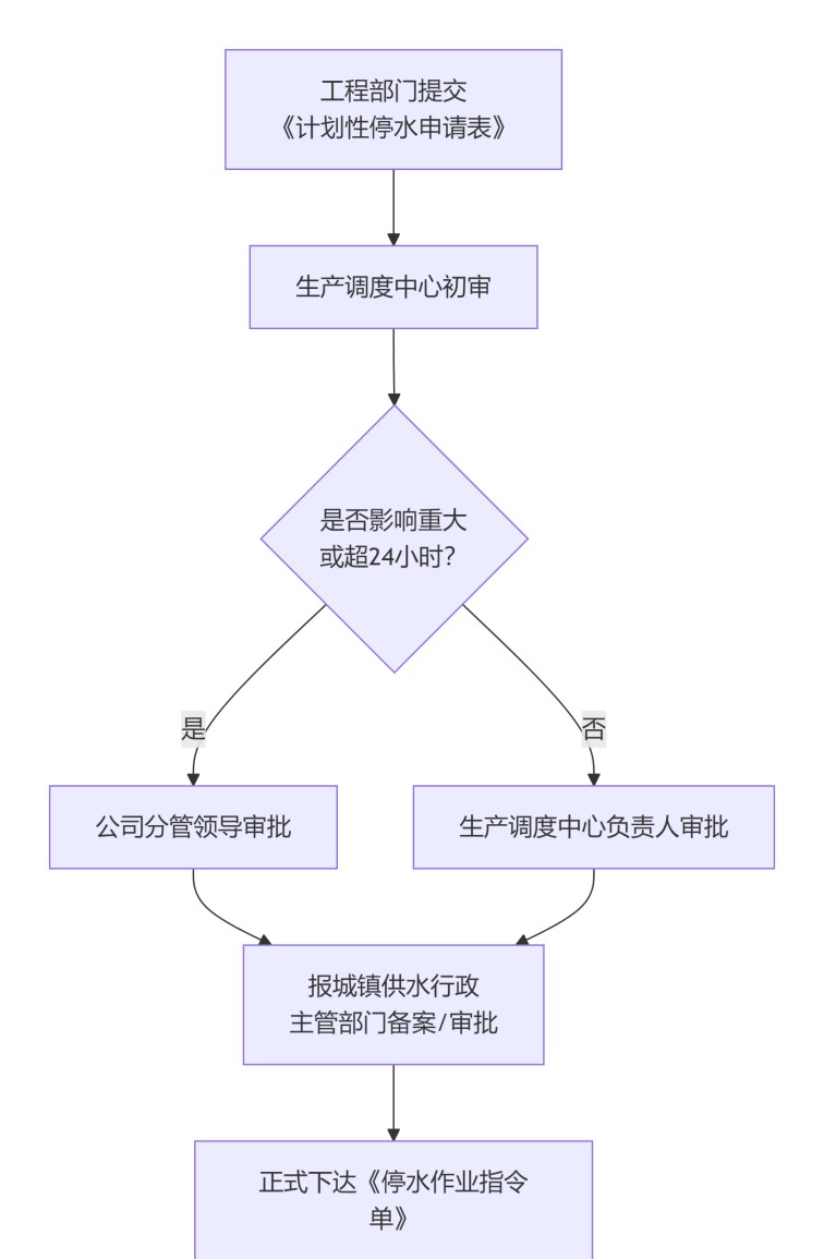 內(nèi)部審批:調(diào)度中心對(duì)停水的必要性、時(shí)長(zhǎng)和范圍進(jìn)行初審。影響范圍廣或停水時(shí)間預(yù)計(jì)超過(guò)24小時(shí)的重大作業(yè),需報(bào)公司分管領(lǐng)導(dǎo)批準(zhǔn)。