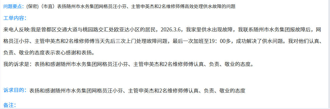 近日,隨州水務(wù)集團(tuán)收到市民通過(guò)12345政務(wù)服務(wù)便民熱線打來(lái)的專(zhuān)屬表?yè)P(yáng)電話,市民王女士對(duì)工作人員高效響應(yīng)、貼心服務(wù)的表現(xiàn)致以誠(chéng)摯感謝。這一通暖心來(lái)電,既是對(duì)供水服務(wù)的高度認(rèn)可,更是水務(wù)集團(tuán)堅(jiān)守民生初心、彰顯服務(wù)溫度的生動(dòng)體現(xiàn)。